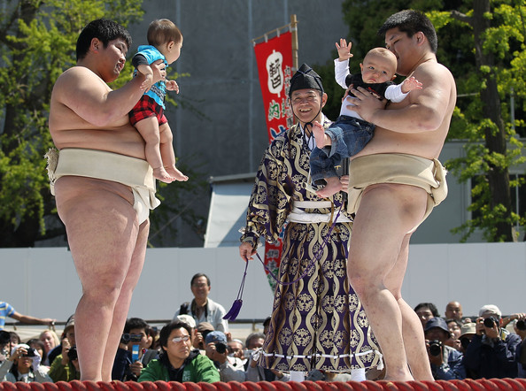 Sumo wrestling students hold babies as they try to make them cry during the Crying Sumo competition at Sensoji Temple on April 25, 2010 in Tokyo, Japan. The first baby to cry wins the competition. The ceremony takes place in Japan to wish for the good health of the child as it is said that crying is good for the health of babies.